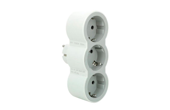ADAPTADOR FRONTAL TRIPLE 10/16A. 230V. Potencia Máx. 3680W. 3 tomas frontales +tierra. Entrada vertical. Blanco/Gris claro.