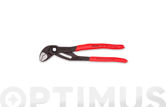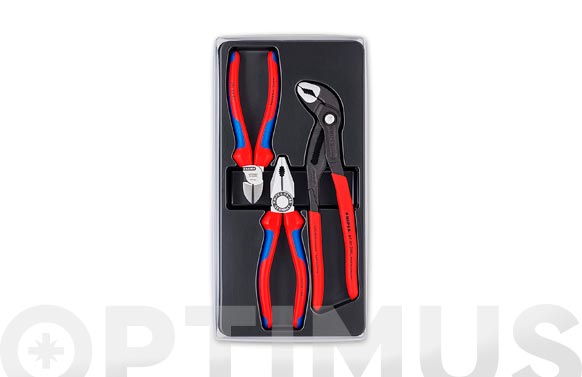 Herramientas en embalaje de plástico con tapa transparente. Atractivapresentación con perforación Euro estándar. Dimensiones (A x A x P): 170 x 370 x 40 mm. Alicates de cabeza pulida; mangos con fundas de plástico antideslizante o en 2 componentes bicolor. Knipex Alicate universal 180 mm, Knipex Alicate de corte diagonal 160 mm. Knipex KNIPEX Cobra®, Tenaza para bombas de agua Hightech 250 mm .