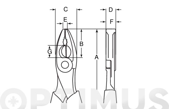 Alicate universal diseñado según los procesos científicos ERGOÖ. ISO 5746. Acabado: Cromado, tratamiento anticorrosión. Material: Aleación de acero de alto rendimiento. Mangos bi-componente ERGOÖ, superficie termoplástica de polipropileno para un mejor agarre. Filos reforzados especialmente diseñados para cortar materiales más duros como la cuerdade piano y alambre de acero. Las superficies de agarre son adecuadas para material redondo y plano. Bocas redondeadas que mejoran la accesibilidad en espacios reducidos. Se ha reducido la distancia del remacheal centro del filo de corte: mayor acción de palanca y capacidad de corte. Lleva incorporado un muelle retraíble. IP: Embalaje industrial. A- 200 mm. B – 39 mm. C – 27 mm. D – 13 mm. E – 4,5 mm. F – 12 mm. G -16 mm. 300 g.