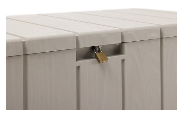 ARCÓN DE RESINA BRAVO. Colro gris. Capacidad 270 l. Medida 117,5×45 cm y alto 56 cm. Apto para poner candado. Con tratamiento anti UV. Apto para usar como asiento con máximo 220 kg.