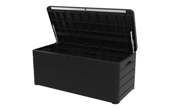 Arcon multifuncional, acabado imitación madera. No requiere herramientas. Sistema de apertura con pistón neumático. Válido como asiento, soporta 320 kg