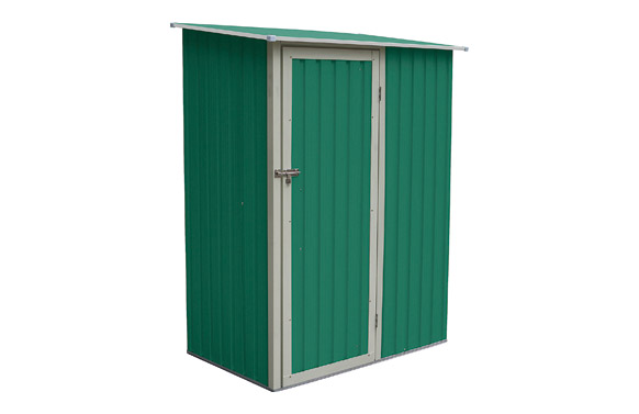 Armario MEtalico NEWCASTLE VERDE 1.27m2. Medidas exterioes 143 (ancho)x 89 (fondo) x 186 (alto) cm. Puerta abatile 66x170cm. Diseño compacto a 1agua. Color verde con bordes blancos. Se vende sin suelo y no esta disponible por separado.
