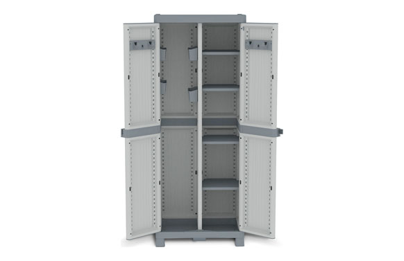 Armario Escobero 2 puertas con cierre Anti-viento Lock System. Cuatrobaldas (15Kg por balda) Incluye Accesorios. Muy Resistente y fácil montaje. Opción para poner candado