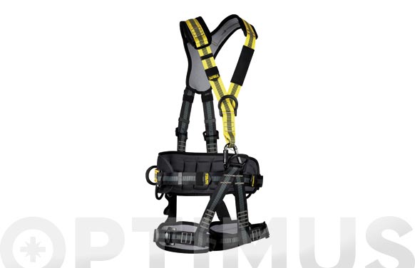 Arnés anticaídas con arnés de asiento y con cinturón de posicionamiento. Enganche ventral, dorsal, frontal y cinturón de posicionamiento regulable con anillas de sujeción laterales según EN358. Arnés de gran ergonomía, ligereza y versatilidad. Anilla dorsal y esternal en aluminioy acordes con la EN361. Anilla ventral en aluminio acorde con la EN813. Anillas laterales en cinturón en aluminio acordes con la EN358. Espalda y perneras acolchadas. Cinturón de posicionamiento regulable conanillas para trabajos de posicionamiento en postes, torres, etc. Dobleregulación arnés y regulación en perneras para mejor adaptación. Usosy empleo: en actividades que requieran trabajar en suspensión, con riesgo de caída en altura y necesidad de posicionarse para trabajar en actividades relacionadas con la construcción, mantenimiento de fachadas, torres, postes y andamios, industria, refinerías, plantas generadoras, montajes, rescate y emergencias…