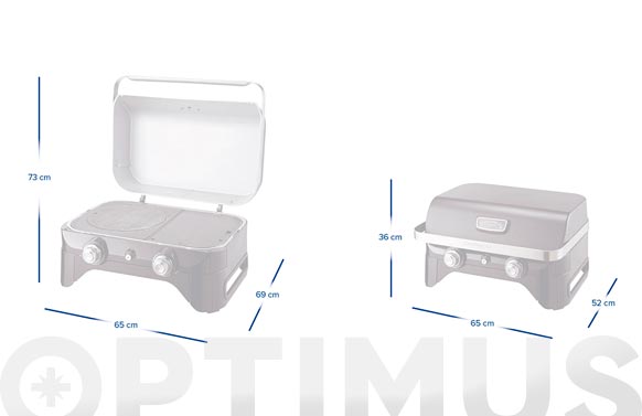 Potencia: 5,000W . 2 Quemadores de acero aluminizado.Superficie de cocina 2.100 cm2. Dimensiones de cocción 58×36 cm. Plancha / Parrilla dehierro fundido esmaltado semibrillante. Temperatura homogénea graciasa Tecnología Even Temp® . Múltiples opciones de cocinado con Módulo Culinario. Encendido Piezo electrónico.Sistema Insta Clean ™ integradopara fácil limpieza en lavavajillas. Termómetro. Formato compacto preensamblado, con asas integradas, para fácil transporte. Peso: 24,5 kg.Dimensiones abierta en cm: 65 x 69 x 73 y cerrada en cm: 65 x 52 x 36.