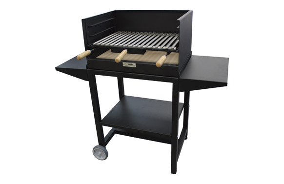 BARBACOA RECTANGULAR CON BASE REFRACTARIA. Fabricada en acero, con base de ladrillo refractario. Apta para carbón y leña. Dos alas y parrilla con recoje aceite que se puede colocar en 3 alturas. Dos ruedas. Parrilla 56 cm x 40cm