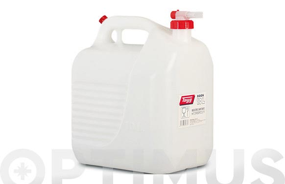 Bidón 10 litros con tapón y grifo. Con toma de aire para garantizar unvertido uniforme. Material HDPE. Apto para uso alimentario.