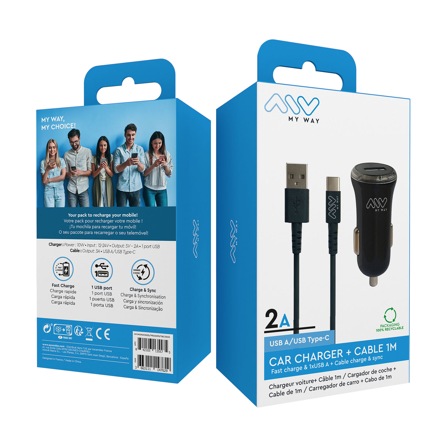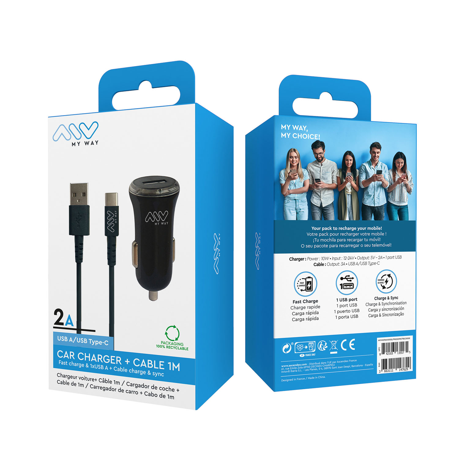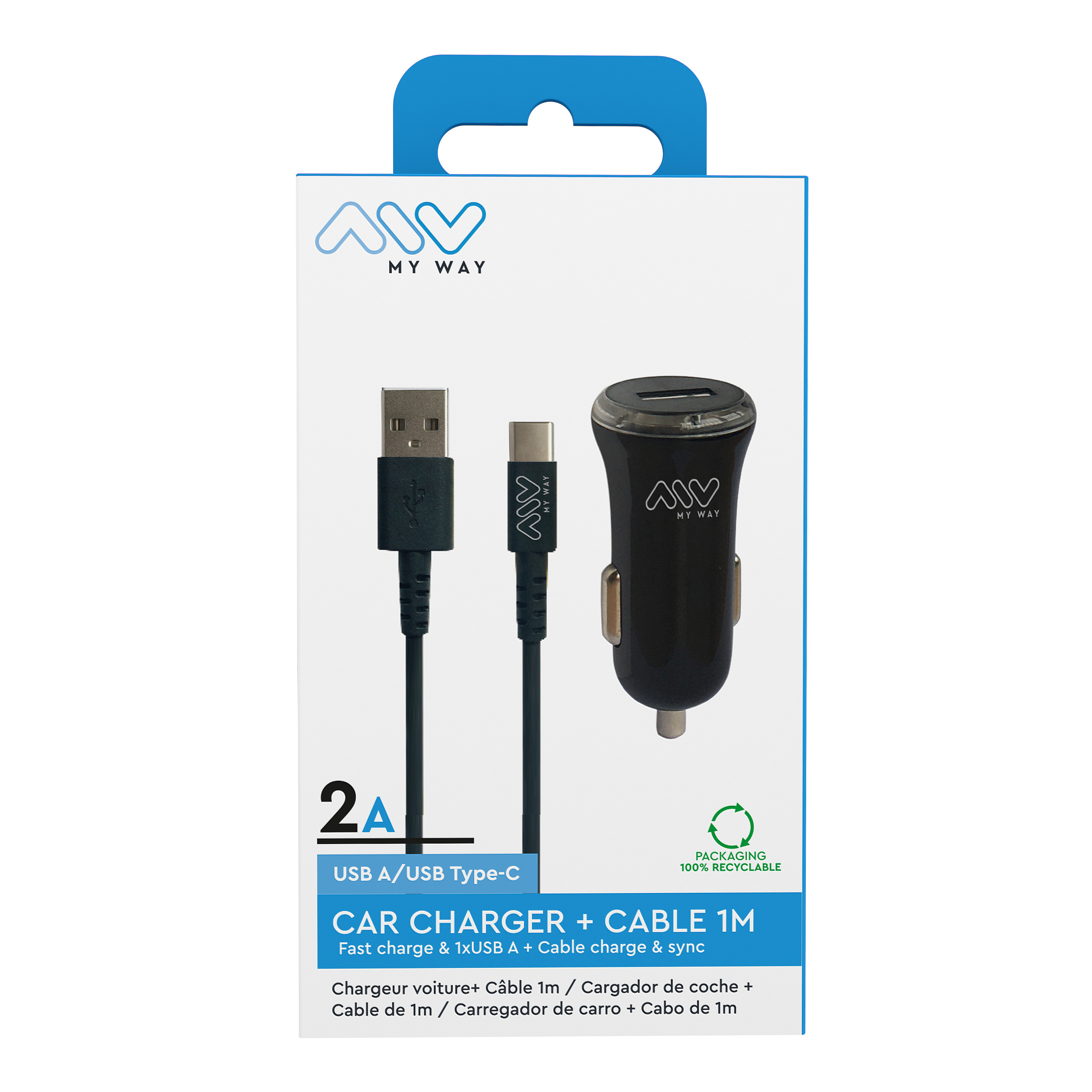 CARGADOR AUTOMOVIL USB + CABLE TIPO C 2A 15,6X8X3CM ABS NE – PACK