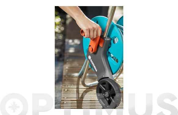AquaRoll S, sin montar Capacidad: 13 mm (1/2″) 40 m; 15 mm (5/8″) 30 m; 19 mm (3/4″) 25 m Manillar de altura ajustable, conexión inclinada de la manguera, sistema anti-goteo, manivela lateral de libre movimiento.
