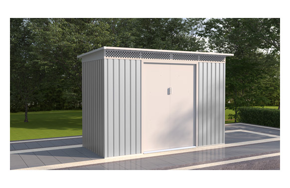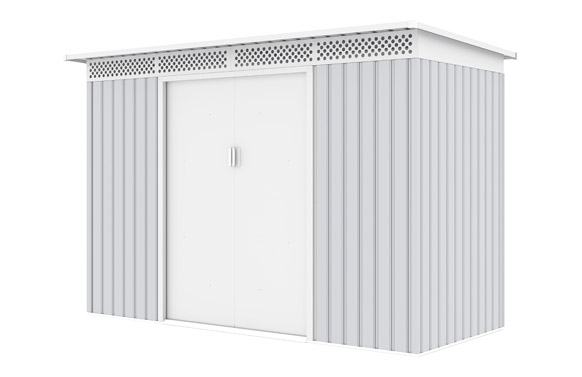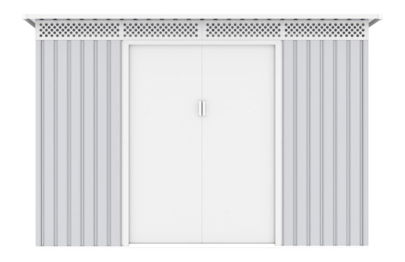 CASETA METALICA DE JARDIN. Chapa galvanizada 0,25 mm. Superficie 3.93 m². Puerta deslizante de 117×162 cm. Medidas exteriores 277 (ancho) x 142 (profundo) x 184 cm (altura). Color plata. Kit de preinstalación de suelo.