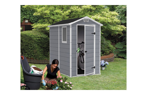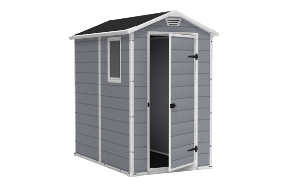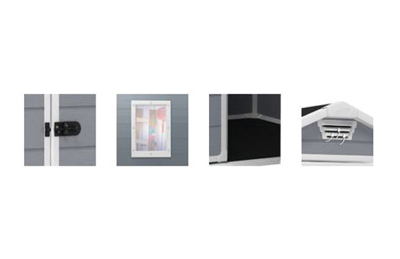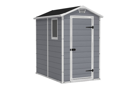 CASETA RESINA MANOR 4X6S. Medidas exteriores ancho 130 cm altura 198 cm fondo 192 cm. Medidas interiores ancho 111cm altura 177 cm fondo 177 cm. Paneles de polipropileno extrusionado 100% reciclable. Perfiles metálicos con tornillería. Suelo, ventana fija y rejilla de ventilación incluidos. Cierre apto para candado (no incluído). Puerta 63 cm. Color gris. Peso 45,5 kgs.