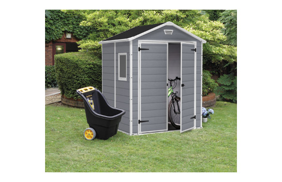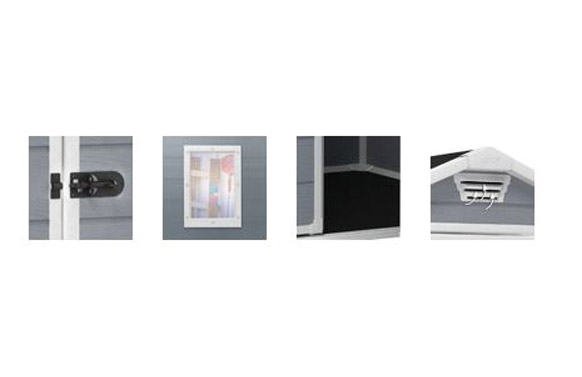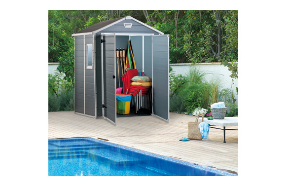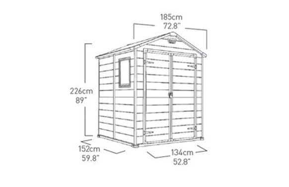 CASETA RESINA MANOR 6X5DD. Medidas exteriores 185X152 cm alto 226 cm. Medidas interiores 169X138 cm alto 220 cm. Paneles de polipropileno extrusionado 100% reciclable. Perfiles metálicos con tornillería. Suelo, Ventana fija y rejilla de ventilación incluidos. Cierre apto para candado (no incluído). Puerta doble de 134 cm. Color gris.