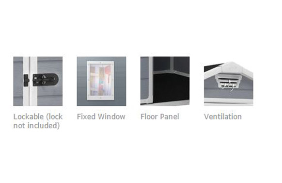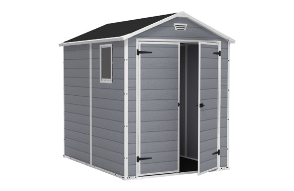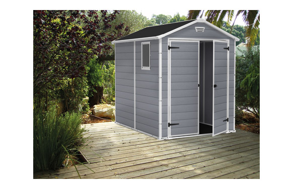 CASETA RESINA MANOR 6X8DD. Medidas exteriores 186X237 cm, alto 226 cm Interiores 169×220 cm alto 220 cm. Paneles de polipropileno extrusionado 100% reciclable. Perfiles metálicos con tornillería. Suelo, Ventana fija y rejilla de ventilación incluidos. Cierre apto para candado (no incluído). Puerta doble de 134 cm. Color gris. Peso bruto 77,2kg