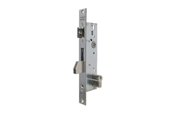 Cerradura de embutir para carpintería metálica. Entrada 30 mm. Picaporte reversible. Palanca basculante. Cilindro de 60 mm. Frente y cerradero inox