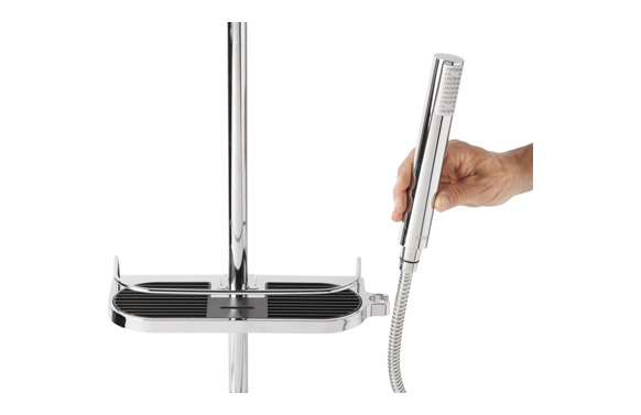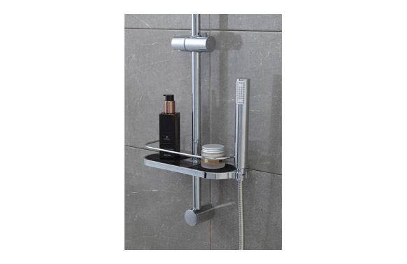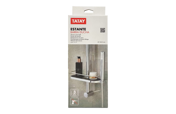 Fabricado en ABS cromado + barandilla metálica cromada, de fácil instalación sin taladro ni pegameno, incluye varios juegos de puños de goma de diferentes tamaños para cubrir diferentes diámetros de barras de ducha, ajustable en altura.