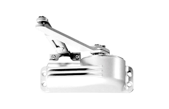 Cierrapuerta hidráulico con mecanismo de émbolo-biela-manivela. Para puertas de 96 a 110 mm de ancho y de 61 a 80 kg. Fuerza regulable EN4.Velocidad de cierre regulable. Retenedor