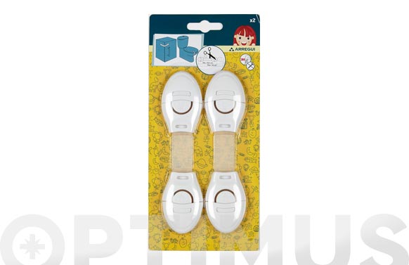 Cierre de seguridad comodo y fácil de desbloquear por un adulto. Ideal para muebles y electrodomésticos de uso habitual. Regulable, se puede cortar a medida. Blister con dos unidades