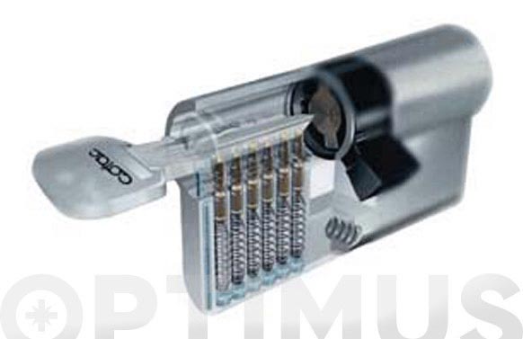 Cilindro de seguridad, de llave reversible de puntos y seis pitones. Este cilindro incorpora protecciones anti-taladro, anti-bump y anti-ganzúa. Se comercializa con pitonaje de alpaca lo que proporciona una durabilidad superior a 100.000 ciclos. Este cilindro se caracteriza porser una solución básica adecuada para accesos comunes y de vivienda. La plataforma que soporta su fabricación permite combinar un máximo de7 alturas por puesto. Sistema apropiado para aquellos amaestramientosdonde los niveles de complejidad no son demasiado elevados. Por ejemplo, 100 funciones de llave diferentes. Disponible en un amplia gama demedidas y perfiles. Se sirve con 5 llaves de latón niquelado y esta certificado según la norma EN-1303.