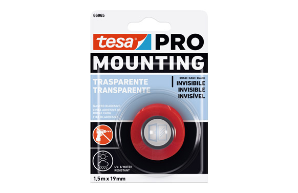 CINTA MOUNTING PRO DOBLE CARA SUPERFICIES LISAS 25m x 19mm. Para fijarobjetos planos tanto en espacios interiores como exteriores. Usoen superficies como el cristal, los azulejos, la madera acabada y muchos tipos de plástico. La cinta transparente y extra fina puede resistir temperaturas de hasta 100°C. Es resistente a los daños causados por la humedad, (ciertos) productos químicos, agentes suavizantes y la luz ultravioleta. Una sola tira de 10 cm puede soportar hasta 2 kg. Es la solución perfecta para montar artículos en superficies transparentes y sólidas.