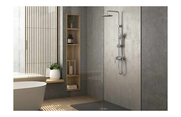 Columna con kit acabado cromado de alta calidad. Para instalación en pared. Se suministra con rociador orientable, mango de ducha con 3 funciones, soporte de ducha deslizante y orientable y flexo de ducha de 1.5 m en acero inoxidable cromado. Posee un sistema innovador -la función de inversor en el propio cartucho, evitando de esta manera un inversor externo o un segundo mando.