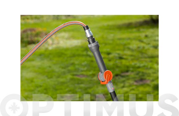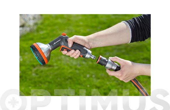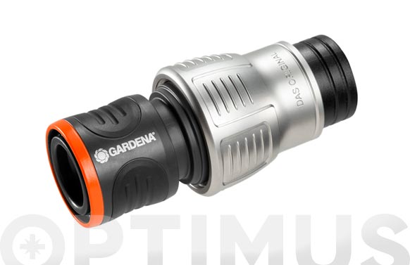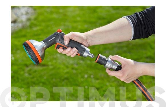 El regulador stop Premium de GARDENA está hecho en metal de alta calidad y plástico, lo que permite conectar de forma rápida y sencilla cualquier dispositivo a la manguera.