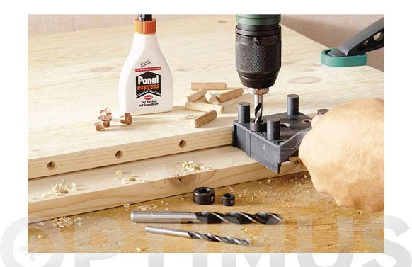 El set de iniciación completo. Para espigas de madera de 6, 8 y 10 mm.Para todas las uniones con espigas corrientes, como uniones angulares, en T y de superficies precisas y sólidas.Contenido: 1 maestro para espigado de madera. 26 espigas de madera, ø 6 mm. 22 espigas de madera, ø 8 mm. 16 espigas de madera, ø 10mm. 3 brocas para madera, ø 6, 8, 10 mm. 6 marcadores, 2 pzas. de cada ø 6, 8, 10 mm. 3 topes de profundidad, ø 6, 8, 10 mm. 1 cola para madera, 20 ml. En maletín de plástico.