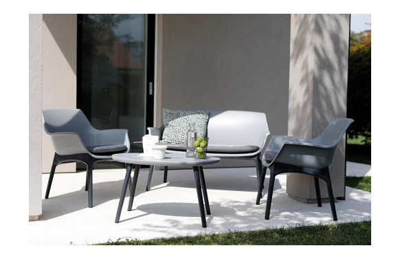 Resina color gris con patas grises, incluye cojines color gris. Mesa de 80 x 50 x 45 cm, sillón de 68 x 67 x 76 cm, sofá de 118,5 x 67 x 76 cm.