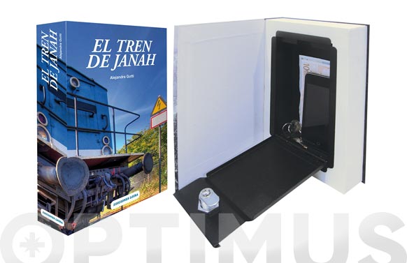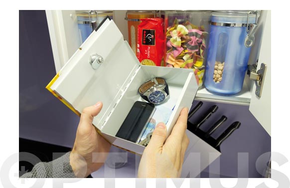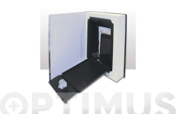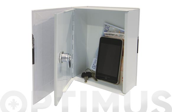 Material: Acero pintado y papel. Simulando ser un libro en su interiorse oculta una caja de seguridad. Incorpora todas las característicaspropias de un libro real, incluyendo las hojas de papel. Dispone de capacidad para pequeños objetos de valor. Ideal para su colocación en cualquier lugar de la casa. Sistema de apertura y cierre mediante llavede serreta.