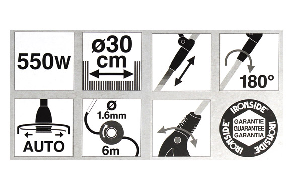 Potencia: 550 W / 1.000 rpm. Ø de corte: 300 mm. 2 hilos de 1,6 mm, sistema autómatico de alimentación del hilo. Con ajuste del angulo de corte. Nivel sonoro: 96 dB. Cable de conexión de 350 mm. Peso 2,32 Kg. Interruptor de gatillo con bloqueo de seguridad. Ajuste telescópico delmango. Empuñadura auxiliar de angulo ajustable. Carrete recambio ref9690521y tapa recambio 9690522. Interruptor 9690523 y motor 9690524