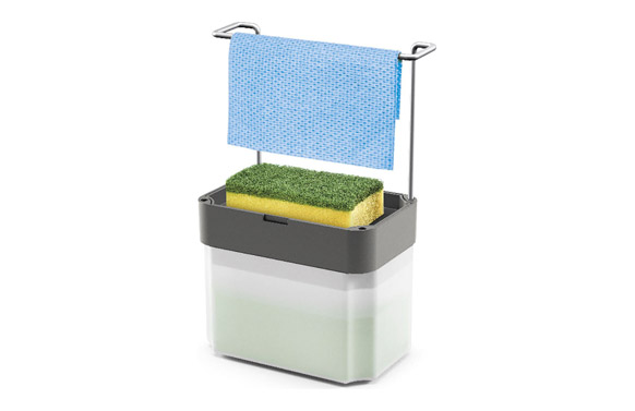 Dispensador de Jabón. Impregne fácilmente la esponja con jabón liquido con sólo una mano, simplemente presionando sobre ella. Cuerpo plástico ABS. Colgador ajustable de acero inox para bayeta. Recipiente translúcido para verificar el nivel de jabón. Con pies antideslizantes. Capacidad 750 ml.