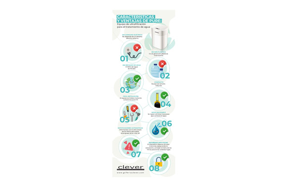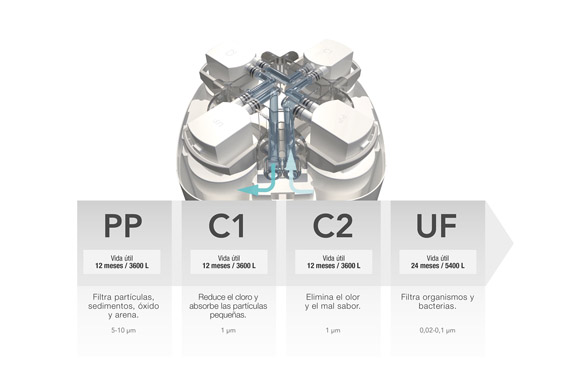 Equipo para el filtrado de agua que combina con cualquier tipo de cocina. Reduce el consumo de plásticos, ahorrando en la factura del agua EQUIPO SIN RECHAZO DE AGUAy ofreciendo una calidad excelente en las propiedades del agua filtrada. El sistema Pure cuenta con cuatro cartuchos instalados para el filtrado del agua. El primer cartucho es el de polipropileno que filtra las partículas, sedimentos, óxido y la arena. Las dos siguientes estaciones del agua son los filtros de pre-carbono y post-carbono diseñados para reducir el cloro, absorber las partículas pequeñas y eliminar el olor y el sabor del agua. El cuarto cartucho es el denominado de ultrafiltración, que cierra el circuito reduciendo los organismos y bacterias restantes.