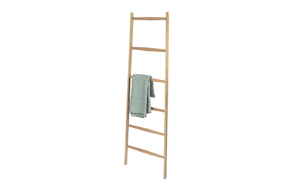 Práctica escalera de madera de acacia para toallas y ropa. Se puede colocar en cualquier lugar.Con 6 toalleros. La veta individual de la madera hace que el producto sea único. Altura del producto 170 cm