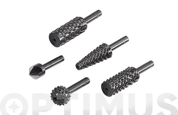 Para la preparación de recortes y la remoción rápida de material material: acero para herramientas. Su contenido es: 1 escofina cilindricapara madera de perfil, ø 12 mm, 1 escofina para madera de perfil, ø 5- 12 mm, 1 escofina cónica para madera de perfil, ø 14 mm, 1 escofina para metales de perfil, ø 12 mm y 1 avellanador esférico para madera, ø 12 mm.