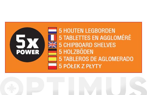 Estructura de acero galvanizado. Estantes de madera DM. Dimensiones totales: H 1860 mm., A 1000 mm., F 600 / 300 mm. 3 estantes de 1000 x 600 mm. (capacidad de carga 200 Kg por estante.) + 2 estantes de 1000 xx300 mm. Altura de la mesa: 88 cm. Montaje fácil sin tornillos.