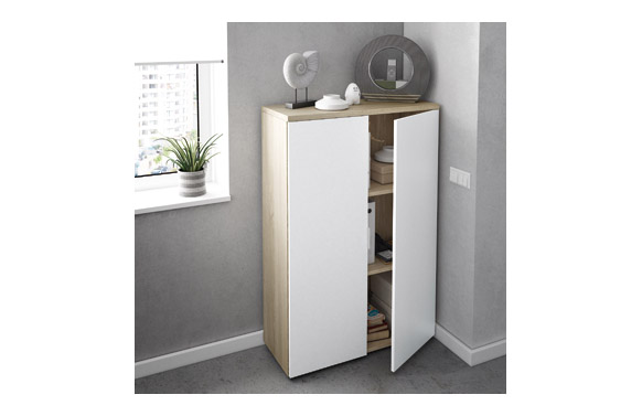 Estantería con puertas fabricado en tablero de particulas melaminizada. 3 estantes interiores.Acabado: Blanco/roble canadian. Dimensiones: 119x80x33cm.
