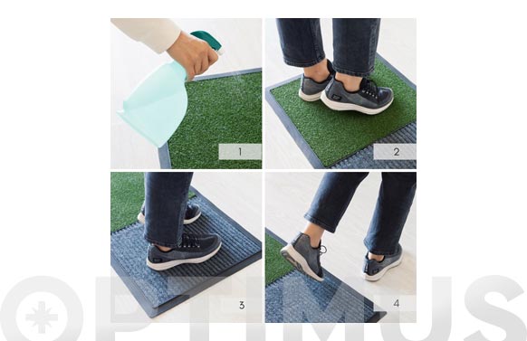 Felpudo desinfectante con dos secciones. Medidas 49x82x0.80 cm. Una delas secciones es de color verde que contiene y absorbe el liquido desinfectante. La otra secion es de color gris que seca la suela del calzado.