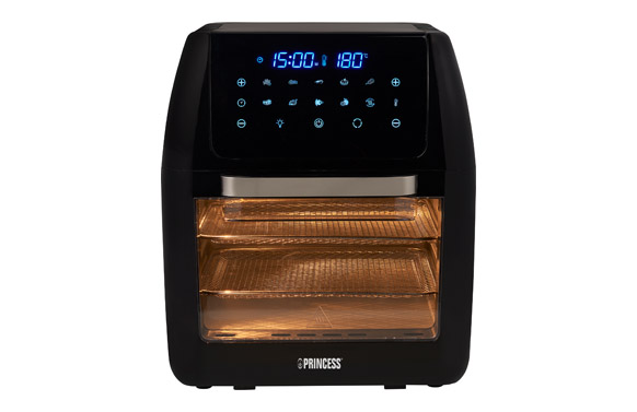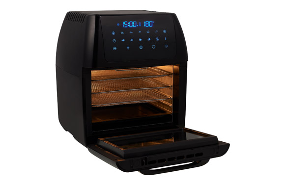 1800W. Capacidad aprox. 12 L. Panel control digital. Convección de aire de alta velocidad. Rango de temperatura 40º – 200ºC. Protección de sobrecalentamiento. Función de deshidratación. Número de rejillas para parrrilla. Bandeja para migas extraíble. Cesta para freír rotatoria. Asa para extraer la bandeja de cocción y rejilla incluída. Base antideslizante.