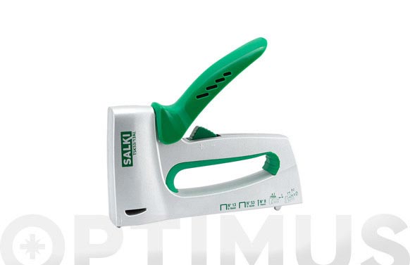 Grapadora manual utiliza grapas 53 o 530 o 13 de 6 a 10 mm, y punta Brad con cabeza Ø 1,25 de 10 mm. Consumible 53/6 – 16 mm 13/6 – 16 mm BN 8/16 mm. Carcasa de aluminio. Peso 0,62 Kg. Características: Regulador de fuerza del grapado. Mango ergonómico con dispositivo de cierre integrado. Carga inferior y fácil resolución de atascos.