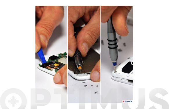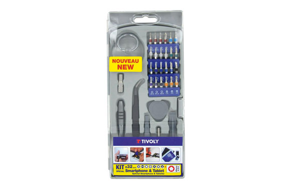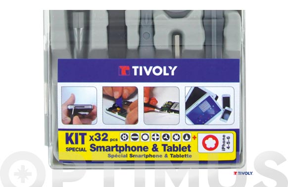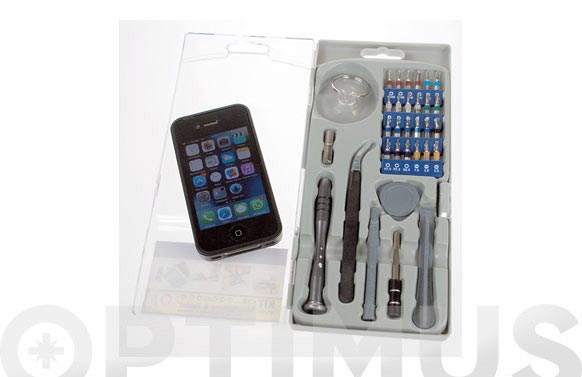 ESTUCHE 32 PIEZAS: 24 PUNTAS, 1 ADAPTADOR 6,35 PARA PUNTAS 4 MM, 1 MANGO DE ATORNILLADO DE PRECISIÓN, 1 ALARGADOR, 1 PINZA BRUSELAS, 2 PALANCAS DE APERTURA, 1 PÚA TRIANGULAR, 1 VENTOSA PARA PANTALLA.