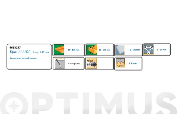 Para madera dura, de densidad media, tablex MDF, y maderas con clavosde 10 a 175 mm. Tablero de fibras de 5 a 175 mm. PVC de 8 a 50 mm. Corte grueso. Bimetal. Longitud 230 mm. Distancia entre dientes 4,3 mm