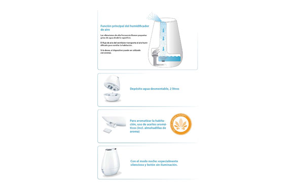 Vaporización ultrasónica micro-fina (silenciosa). Para oficinas y estancias de hasta +/-20m². Salida nebulización hasta 200 ml/h. Higiénico, inodoro. Para un clima perfecto de día y de noche. Depósito agua 2 litros desmontable Filtro de agua opcional. Nebulización de 2 fases.Potencia (bajo consumo): 20 w. Con el modo noche: especialmente silencioso y botón sin iluminación. Para aromatizar la habitación, uso de aceites aromáticos (incl. almohadillas de aroma) Incluye cepillo de limpieza. Apagado auto. cuando el depósito está vacío. (An-Al-Pr): 21 x25.5 x 11 cm. Peso: 810 gr