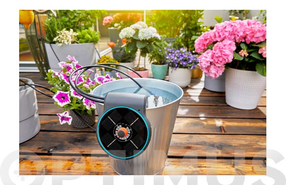 Set de Riego AquaBloom Con todo lo necesario para un riego en terrazao balcón si necesidad de luz o un grifo. Contiene un programador autónomo y solar con 20 goteros de 0.5 litros hora, 20 estacas, 3 bateríasrecargables solares AA, 5 CONECTORES t 4MM, 5 empalmes, filtro y 20 metros de tubo 4mm.