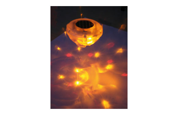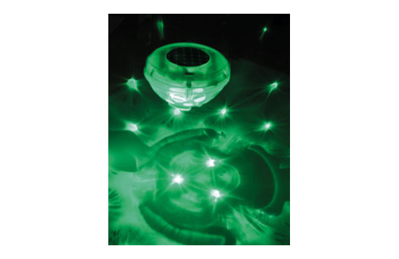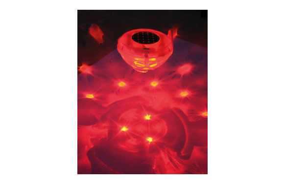 Lámpara fantasía flotante. 8 diodos (LED) emisores de luz en colores brillantes que crean 7 programas de luz diferentes tanto en las paredescomo en el fondo de la piscina. Resistente al agua.