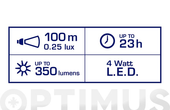 Linterna frontal extremadamente robusta (a prueba de caída de 3 m) conelementos de goma amortiguadora Lente y reflector resistente al impacto Calificación de resistencia al impacto IK08 (IEC 62262) Resistente al agua y polvo (IP67) LED brillante de alto rendimiento 2 niveles de luz: alto y bajo Cabezal giratorio para una iluminación ideal del entorno Cinta de la cabeza ajustable y lavable Rango del foco: hasta 100 m Duración: hasta 23 h Potencia total de alumbrado: hasta 350lúmenes Fuente de luz: 4 Watt LED Modelo de pila VARTA: 3 x Longlife Power AAA