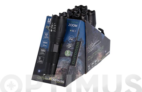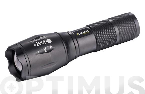 5 posiciones: Alta, media, baja, avistamiento y SOS. Diseño compacto en aluminio de color negro. Linterna con foco regulable (zoom) hasta x2000. Alcance 50 metros. IP65. Funciona con 3 pilas AAA (incluidas). Autonomía 5 horas. Pesa 152 gr.