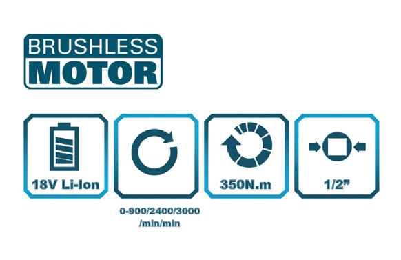 Llave de impacto 1/2″ 300NM, bateria de 18V, 3 velocidades. Motor sin escobillas, velocidad variable, luz led.
