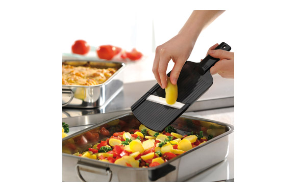 Ideal para cortar rodajas finísimas. Con cuchilla de cerámica ultra-afilada. Incluye sujeta-restos.