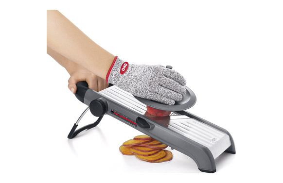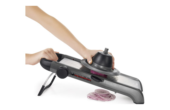 Cuchilla de acero inoxidable en paralelo que cortan los alimentos perfectamente y con facilidad Corte en rodajas en 17 grosores diferentes de 1 a 9 mm Fácil de ajustar y anti-deslizante, con visor muy claro del grosor que estamos utilizando Los dedos y los alimentos quedan protegidos en la parte inferior Su rampa deslizante permite que los alimentos no se peguen Asa y mango OXO grueso y ergon¢mico para hacer menos presi¢n, antideslizan-te incluso con las manos mojadas Sistema de cuchillas integrado para su comodidad y seguridad Apto lavavajillas (cuchillas lavado a mano)