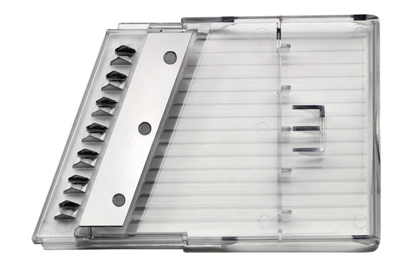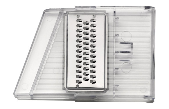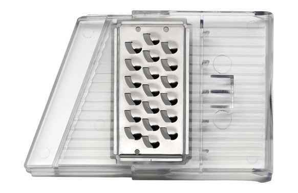 MANDOLINA VARIO CON CONTENEDOR. Serie Veggie-Fit. Incluye 4 accesoriosde corte y rallado y protector para dedos. Espesor de corte ajustable. Hoja extra afilada.