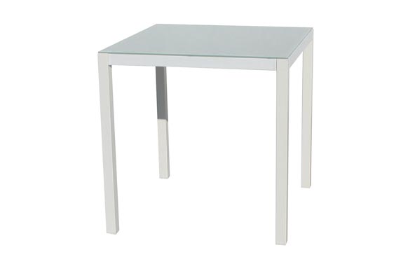 Estructura de aluminio color blanco. Sobre de cristal color blanco, 70x 70 cm. Altura de la mesa 72 cm.